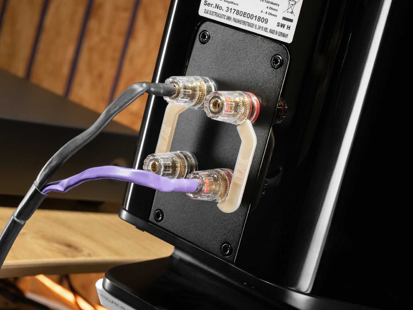 Тыльная сторона акустики немного уже, чем лицевая. Здесь место нашли две пары позолоченных клемм для акустических проводов. Углов как таковых у корпуса Vela BS 403 нет — они аккуратно скруглены, что в совокупности с вышеописанными элементами дизайнерских решений, во-первых, помогает акустике бороться с резонансами и стоячими волнами внутри корпуса, во-вторых — придает акустической системе весьма футуристичный, но при этом и элегантный внешний вид.