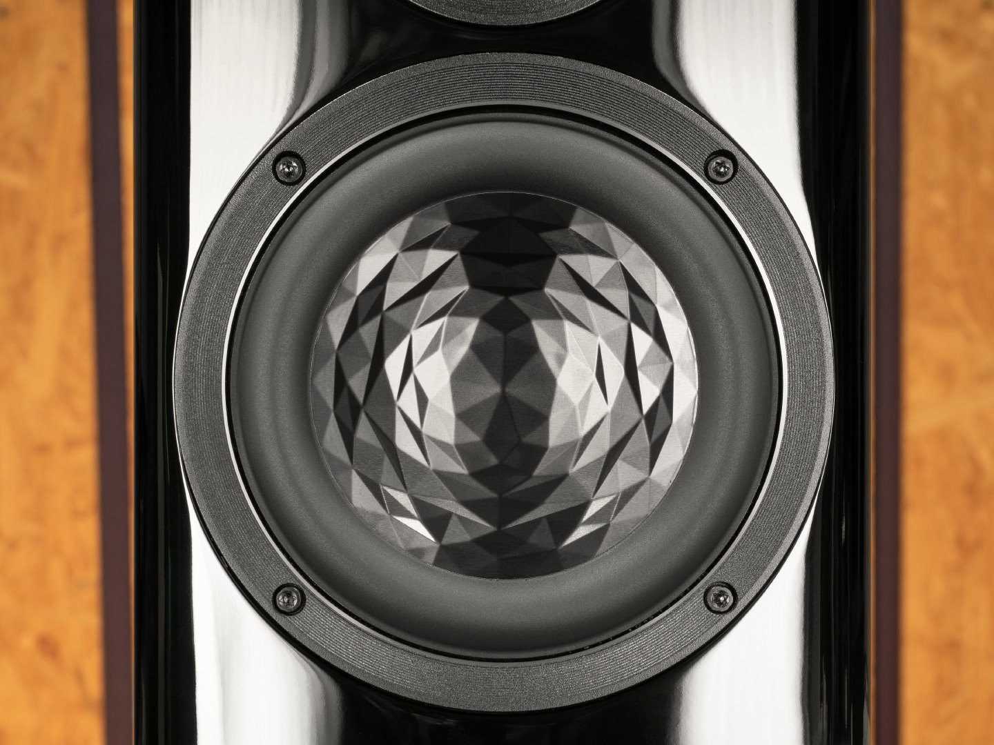 Прежде всего, взгляд приковывает необычно структурированный диффузор динамика диаметром 150 миллиметров, который отвечает за средние и низкие частоты. Первая ассоциация, возникающая при взгляде на этот излучатель — огранка драгоценного камня, не иначе. Блики света, играющие на гранях угольно-черного цвета, создают интересный эффект глубины, хотя, по факту, геометрия диффузора стремится скорее к плоскости, нежели к вогнутой полусфере.