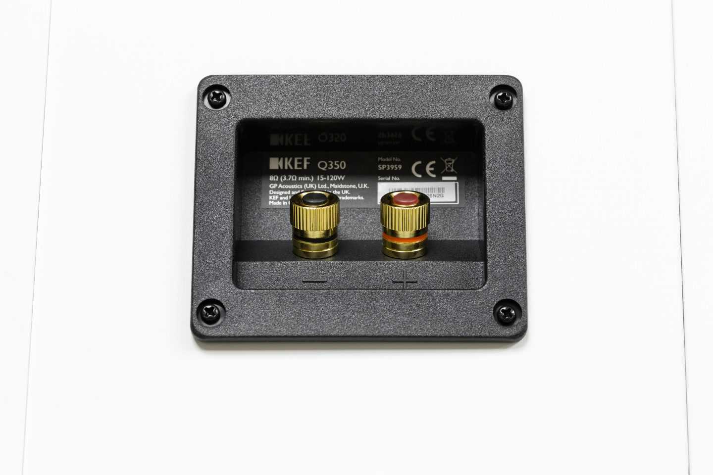 Новшества Q-серии коснулись даже клеммных щитков. Наверняка заядлые меломаны сталкивались со свойством перемычек постоянно теряться, в KEF решили проблему раз и навсегда, «зашив» клеммы внутрь щитка. Теперь они ставятся в рабочее положение и снимаются с него с помощью двух крутящихся ручек. Сами же клеммы — обычные, позолоченные, позволяют пользователю двухкабельное подключение колонок и эксперименты с Bi-Wiring/Bi-Amping.