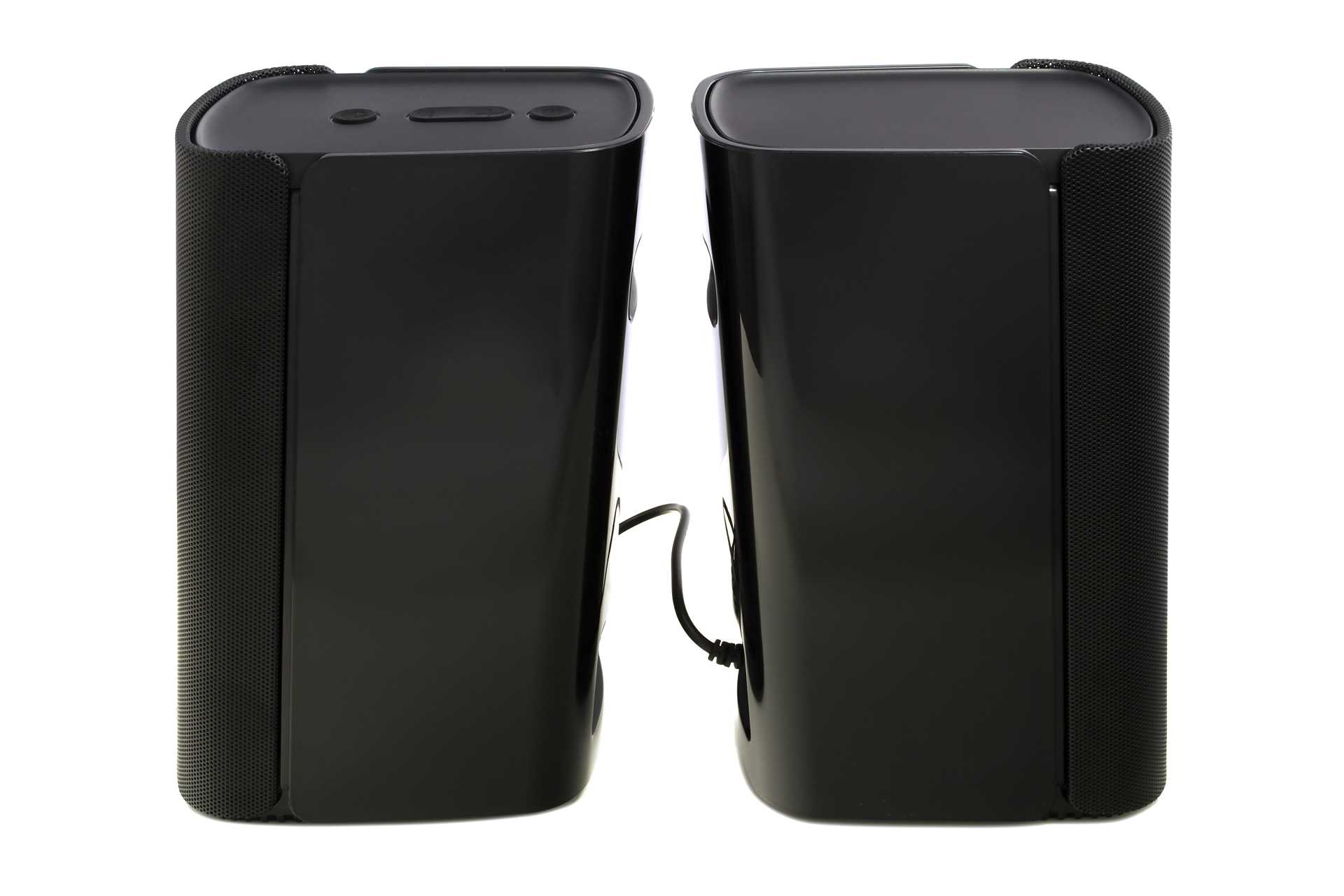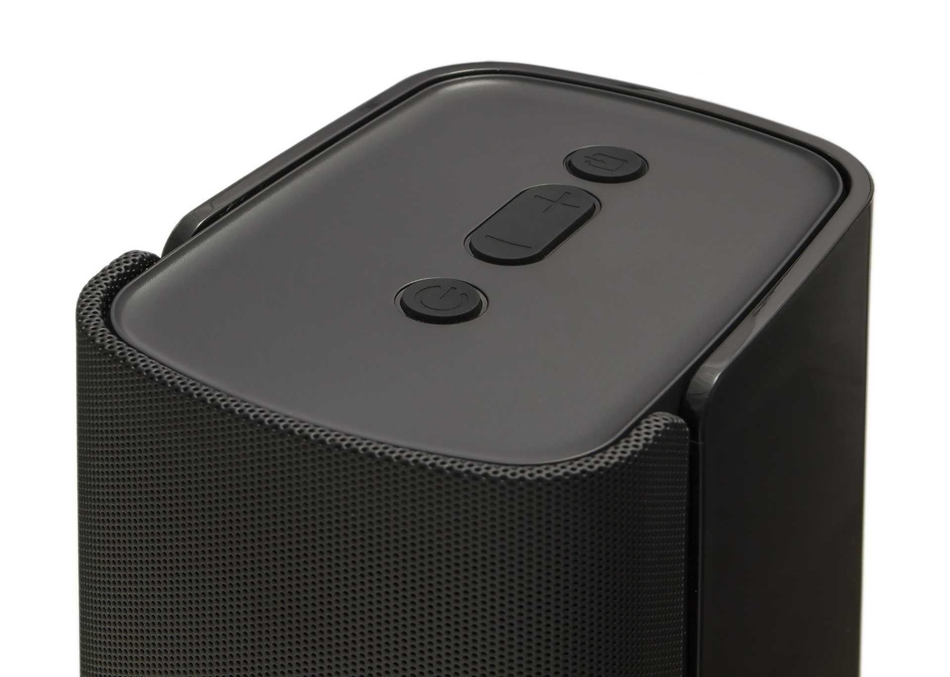 Правая колонка – основная. На её верхней панели расположены органы управления: кнопки включения/выключения, регулировки громкости и выбора источника звука. Верхняя панель левой колонки пустая.