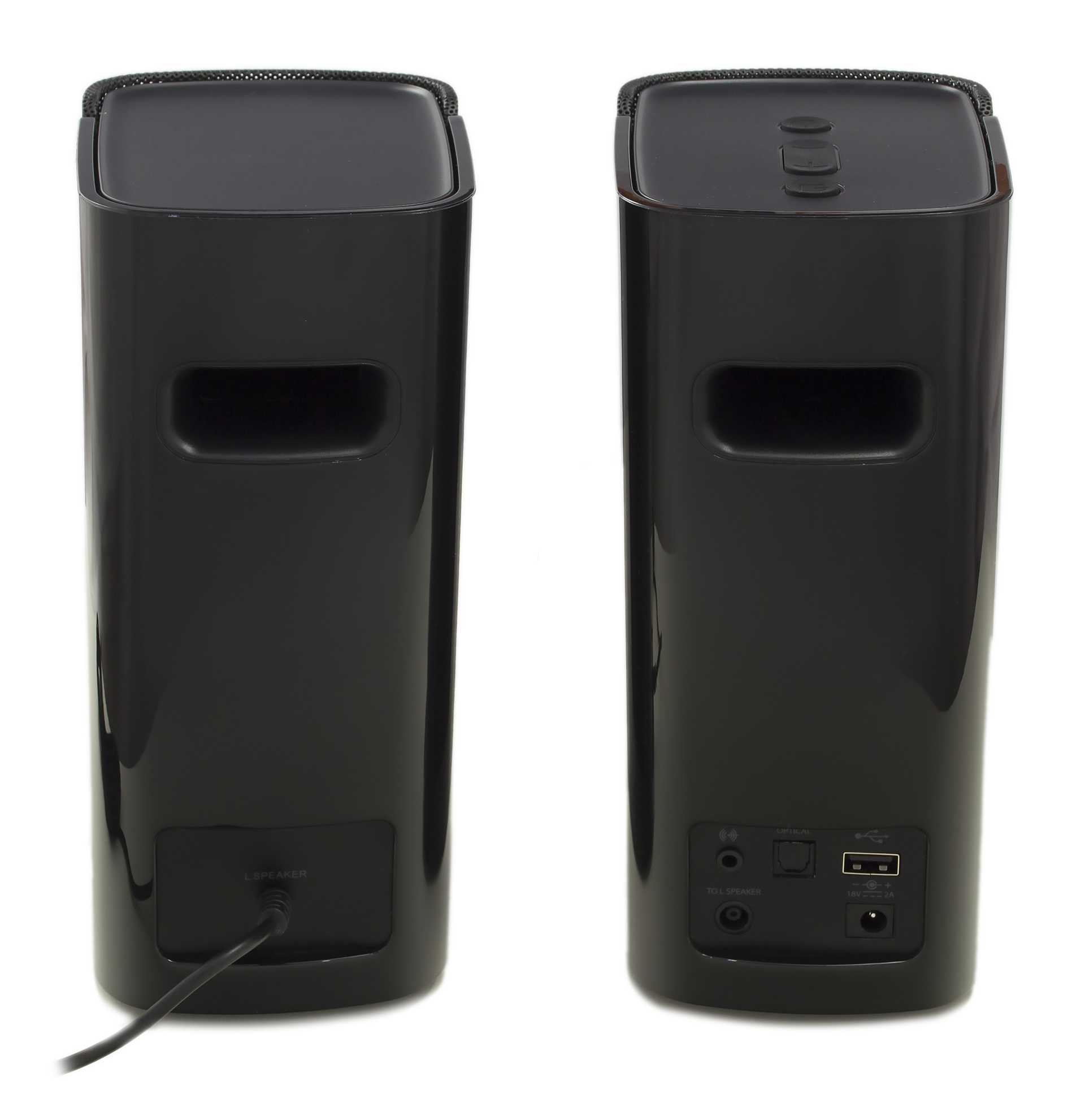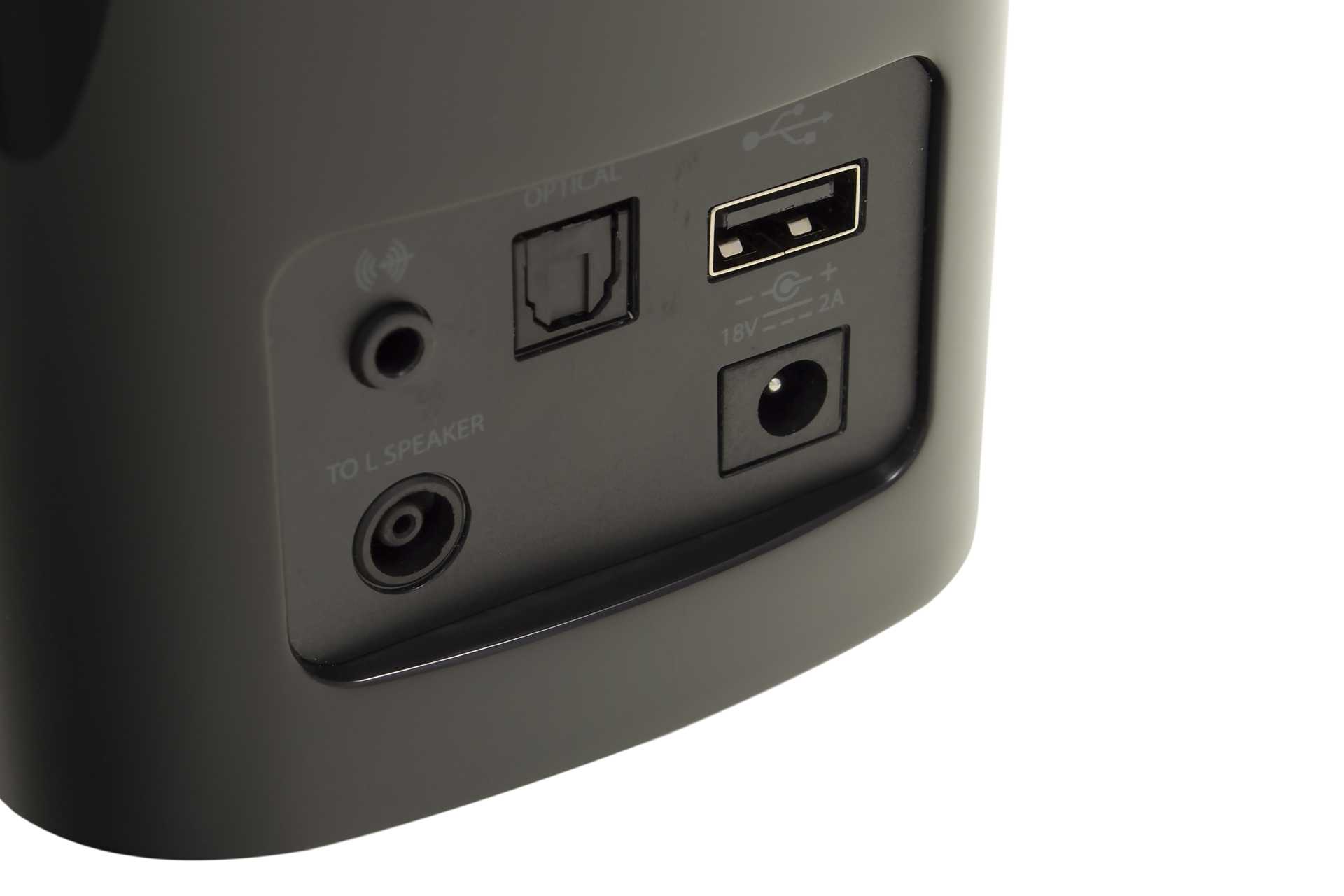 Интерфейсы подключения размещены на задней стороне основной (правой) колонки. Это: AUX, оптический S/PDIF и USB-A, поддерживающий форматы WAV, MP3 и FLAC. Также T100 имеет на борту беспроводной интерфейс подключения Bluetooth 5.0. Здесь же находится гнездо для подключения второй колонки и разъем питания.