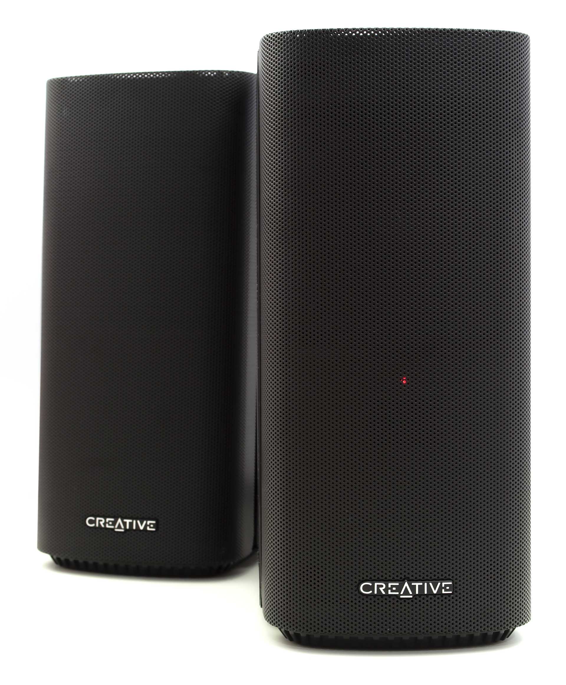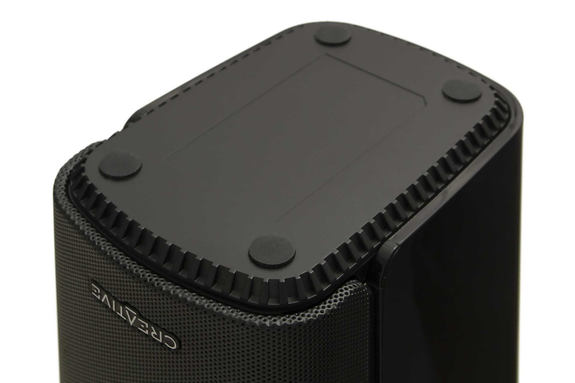 Несъемная передняя панель, прикрывающая динамики, заходит на боковые стороны колонок и представляет собой металлический лист с мелкой перфорацией. Внизу колонок закреплен аккуратный логотип Creative.