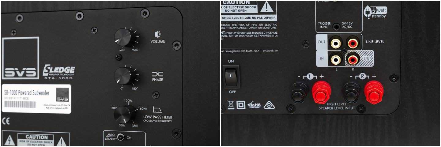 Регуляторы громкости, частоты и фазы выглядят и функционируют вполне аналогово. Непохоже, чтобы процессор задействовали в этой части звукового тракта. Входов у SB-1000 полный набор: стереофонические высоко- и низкоуровневые, а также LFE, совмещенный с низкоуровневым. Наличие высокоуровневых входов окажется удобным при подключении к усилителю с двумя парами клемм. Также имеется стереофонический низкоуровневый выход с фиксированной частотой среза 80 Гц. Последний позволит «разгрузить» усилитель мощности и без процессора в системе.