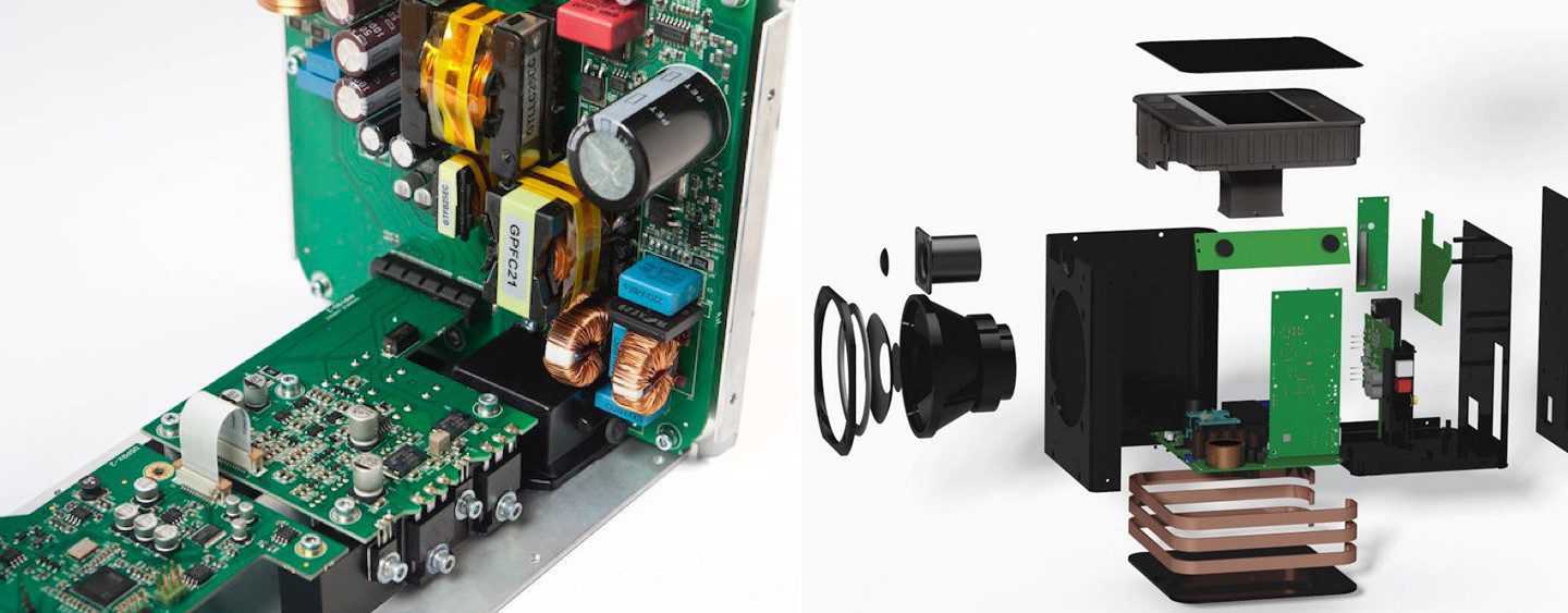 Конструкция акустики двухполосная с выведенным на фасад фазоинвертором, спрятанным под ткань вместе с излучателями. Каждая колонка оснащена усилителем класса AB мощностью аж 150 Вт, схемотехника которого заимствована у фирменного усилителя ECI-3. Подход нетипичный, подавляющее большинство производителей используют в устройствах такого типа более экономичные и компактные усилители класса D. Однако AB-класс объективно должен звучать интересней и обеспечить лучшую микродинамику.