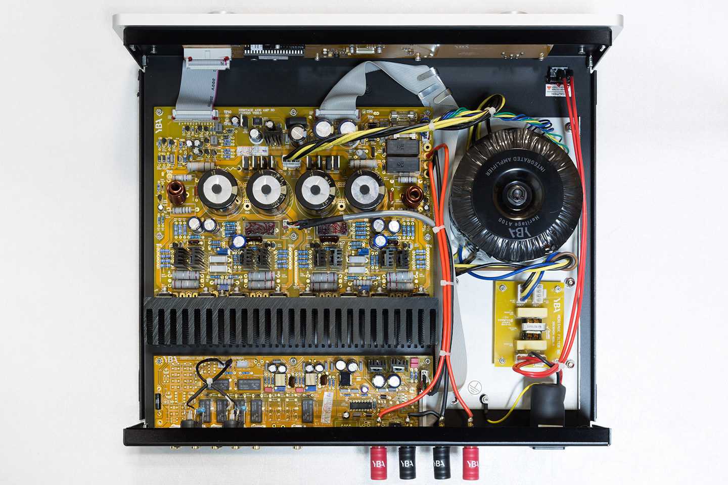 Внутри A100 абсолютная классика: тороидальный трансформатор, большие банки конденсаторов и дискретная схемотехника