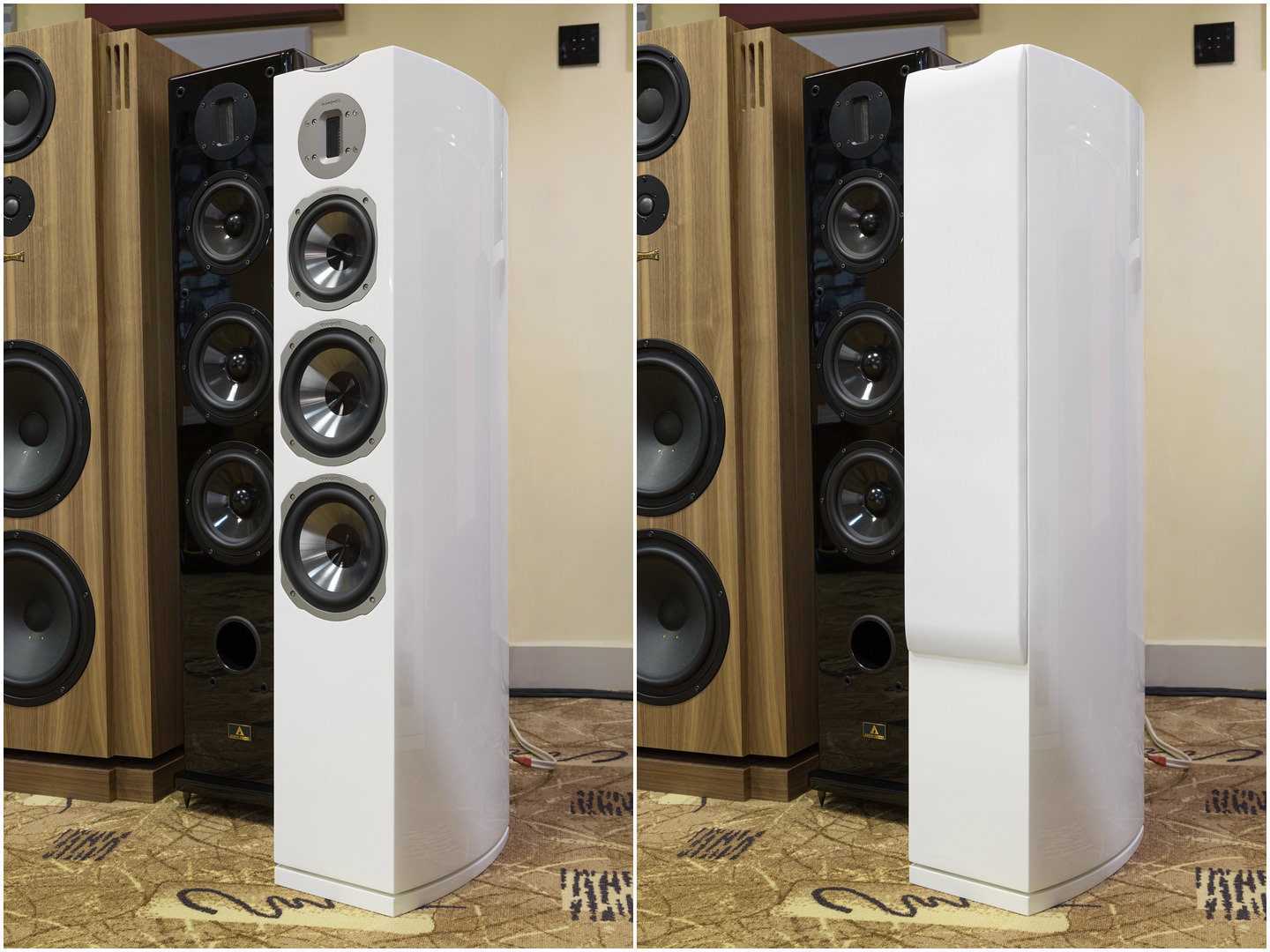 У колонок сложная форма корпуса. И это не только выгнутые наружу бока с узкой задней стенкой. Ее вертикальная ось отклонена в верхней части от слушателя, так что твитер находится чуть дальше, чем низкочастотные излучатели. Это выравнивает фазу сигнала в точке прослушивания, да и просто делает акустику более эстетичной.