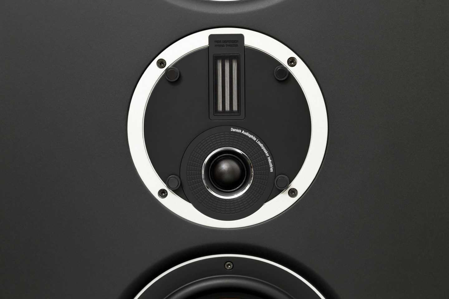 ВЧ-звено состоит из двух активных излучателей: ленточного и динамического с большим 29-мм куполом. Ленточный излучатель отвечает за СВЧ-диапазон и широкое рассеивание звука, а традиционный динамик воспроизводит весь диапазон, начиная с 3000 Гц. В сочетании с возможностью поворота ВЧ-модуля в корпусе это позволяет оптимально сфокусировать звук в точке прослушивания в зависимости от высоты расположения колонок в стене и их ориентации в пространстве.