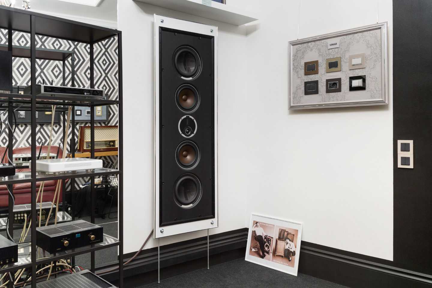 Впрочем, система, которую я слушал в шоуруме, была чем-то средним. Дело в том, что колонки были встроены не в стену, а в тестовые стенды — большие щиты, жестко закрепленные к полу и стене. Это вроде и не встройка в чистом виде, но при этом место внутри помещения используется минимально. Будь это напольники соответствующего объема, их фасад оказался бы ближе к точке прослушивания на 30-50 см, и комнату они заполнили бы не только звуком, но и собой. В данной же ситуации не было ощущения присутствия в комнате больших колонок, особенно когда динамики были закрыты грилями.