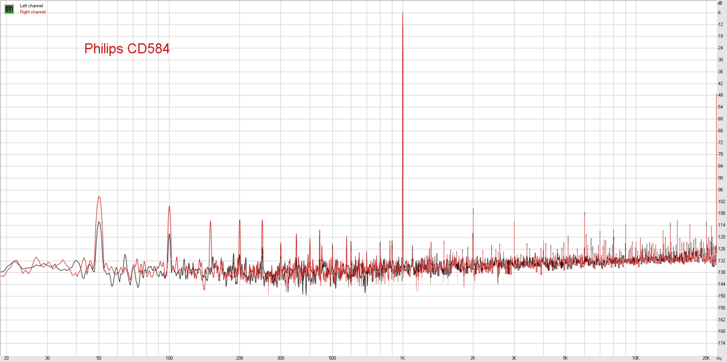 Но если мы до всякой аудиофильской риторики просто посмотрим на картину и характер гармоник вокруг тестового тона 1 кГц, то мы увидим, что в тракте CD584 присутствует наводка частоты питания 50 Гц, которая не учитывается при подсчете гармоник от сигнала 1 кГц. Идем дальше.