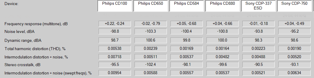Технические измерения по схеме RMAA всех пяти CD-проигрывателей на TDA1541 сведены в таблицу. Сюда для наглядности дополнительно внесен первенец Philips CD100 из предыдущего материала о TDA1540. Если верить только абсолютным цифрам, может сложиться превратное впечатление. Возьмем, например, строку гармонических искажений THD.