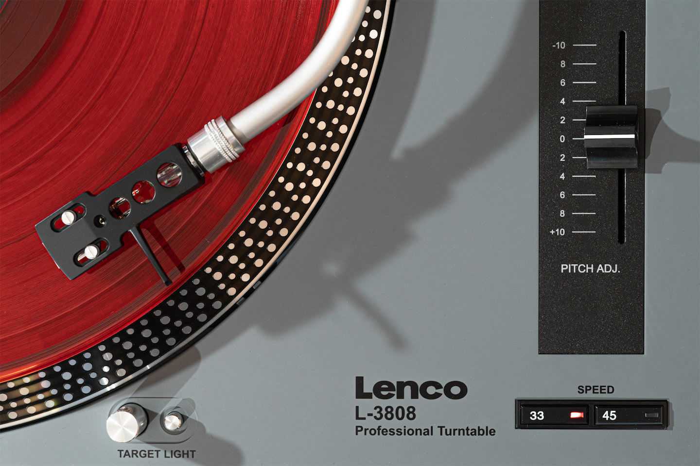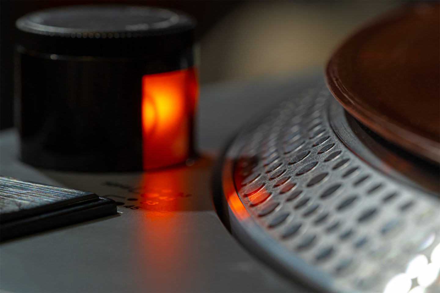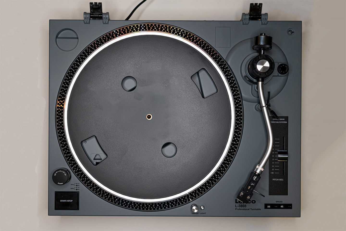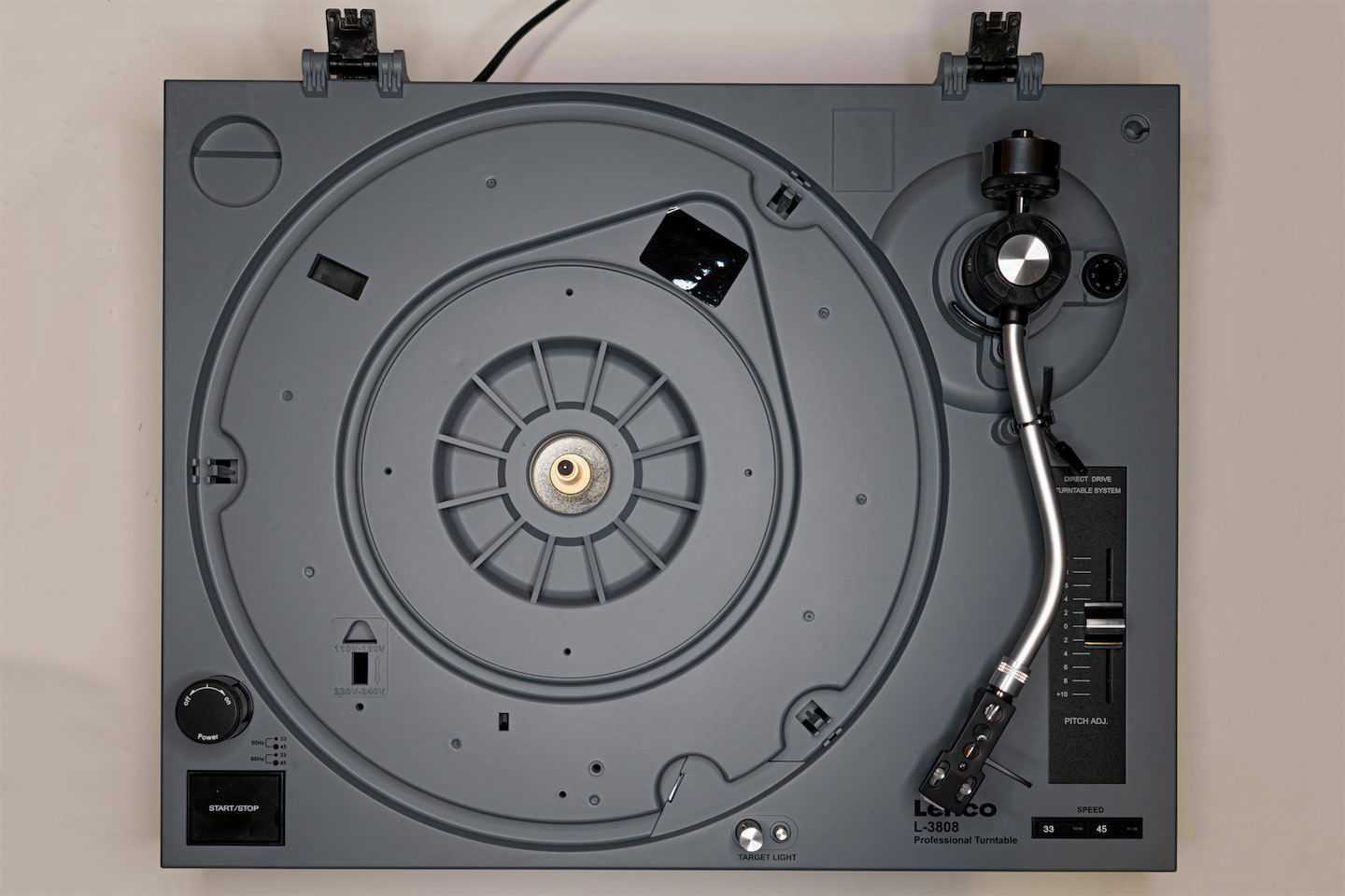 Диск крутится очень легко и плавно, без каких-либо заметных биений. Это полая съемная алюминиевая штамповка, прикрытая штатным фетровым матом. Иногда мне казалось, что он крутится хоть и равномерно, но несколько медленно, поэтому с регулятором питча мне тоже довелось поиграть — но в итоге я все равно выставляла стандартное значение. Под диском в выемке есть переключатель рабочего напряжения — блок питания встроенный, рассчитанный и на 60 Гц, и на 50.