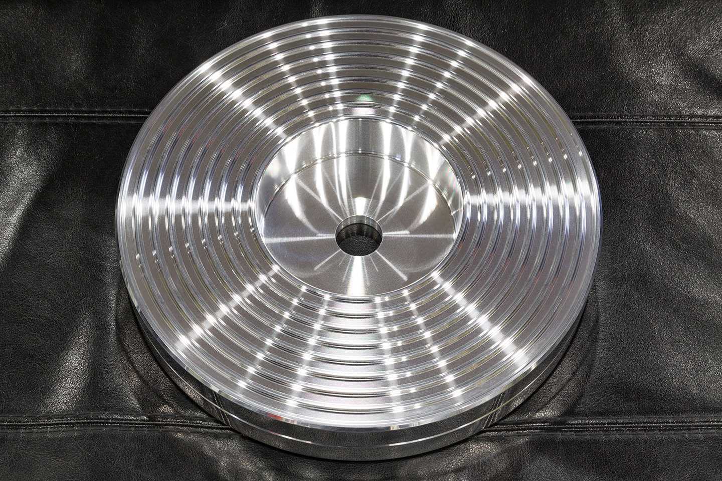 Основной диск проигрывателя весит 10 килограмм, он выточен из цельного куска алюминия. На его нижнюю поверхность нанесены «кольцевые волны» — так разработчики улучшили резонансные свойства диска. Ровно посередине боковой поверхности проточено углубление со сглаженными краями — именно по нему диск охватывает тонкий силиконовый пассик, передающий вращение мотора.