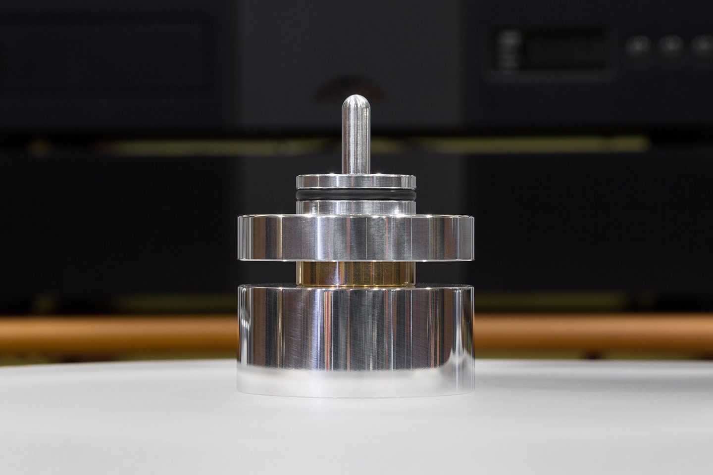 Помимо мата в комплекте идет тяжелый алюминиевый клэмп со встроенным в нижнюю поверхность силиконовым кольцом, которое и прижимает пластинку. Для посадки на шпиндель в клэмпе есть грамотно спроектированная пластиковая вставка — за счет ее формы попасть клэмпом на шкив значительно проще.