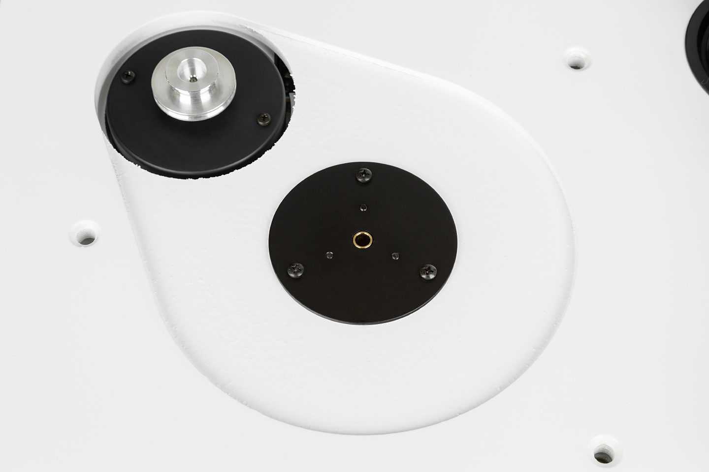 Тут есть один интересный момент. Переключение скоростей у проигрывателя электронное — для этого предназначена единственная кнопка на верхней панели (выключатель расположен снизу). Но у аппарата есть и третья скорость в 78 об/мин — чтобы ее использовать нужно снять основной диск и вручную перебросить пассик на шкиве. Интересный функционал, не у всех аппаратов такое встречается. И в принципе, в той же линейке Ortofon 2M есть головка, предназначенная для шеллака. Так что теоретически можно было бы получить дополнительный необычный функционал.