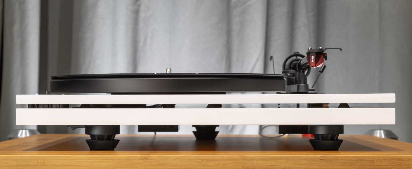 Значимой особенностью этого проигрывателя является тот факт, что на данный момент это самая младшая модель из каталога Music hall, в конструкции которой применена фирменная послойная развязка. Ее основной принцип заключается в том, что разные узлы аппарата расположены на разных уровнях стола. У старших моделей уровней, развязанных друг от друга эластичными сорботановыми конусами, может быть несколько, у нашего же подопытного их два. Это две пластины из МДФ, скрепленные тремя транспортировочными винтами. Если винты убрать, получится, что одна пластина стоит на другой на конусах.