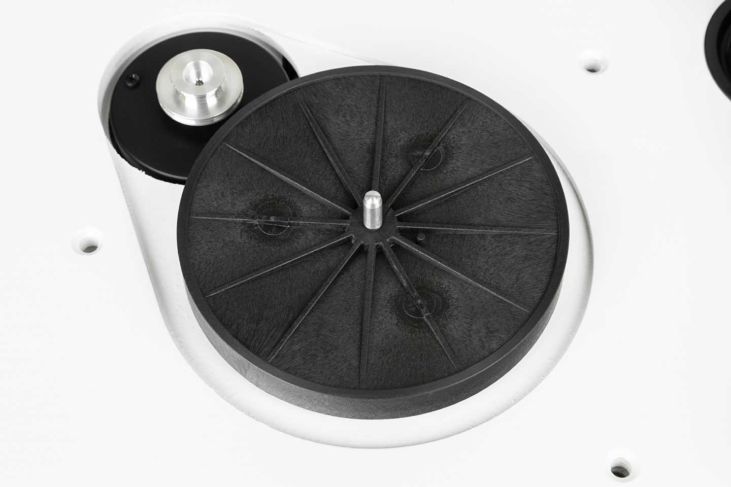 Подшипник у аппарата неинвертированный, с небольшим стаканом и тонким шкивом. Однако подгонка деталей приличная, выдавить воздух из подшипника не так-то просто, да и без пассика диск вращается достаточно долго и тихо. Субдиск пластиковый, несъемный — такой уже встречался у других моделей производителя. Основной диск стальной штампованный, сюда он перешел от младшей модели 2.3.