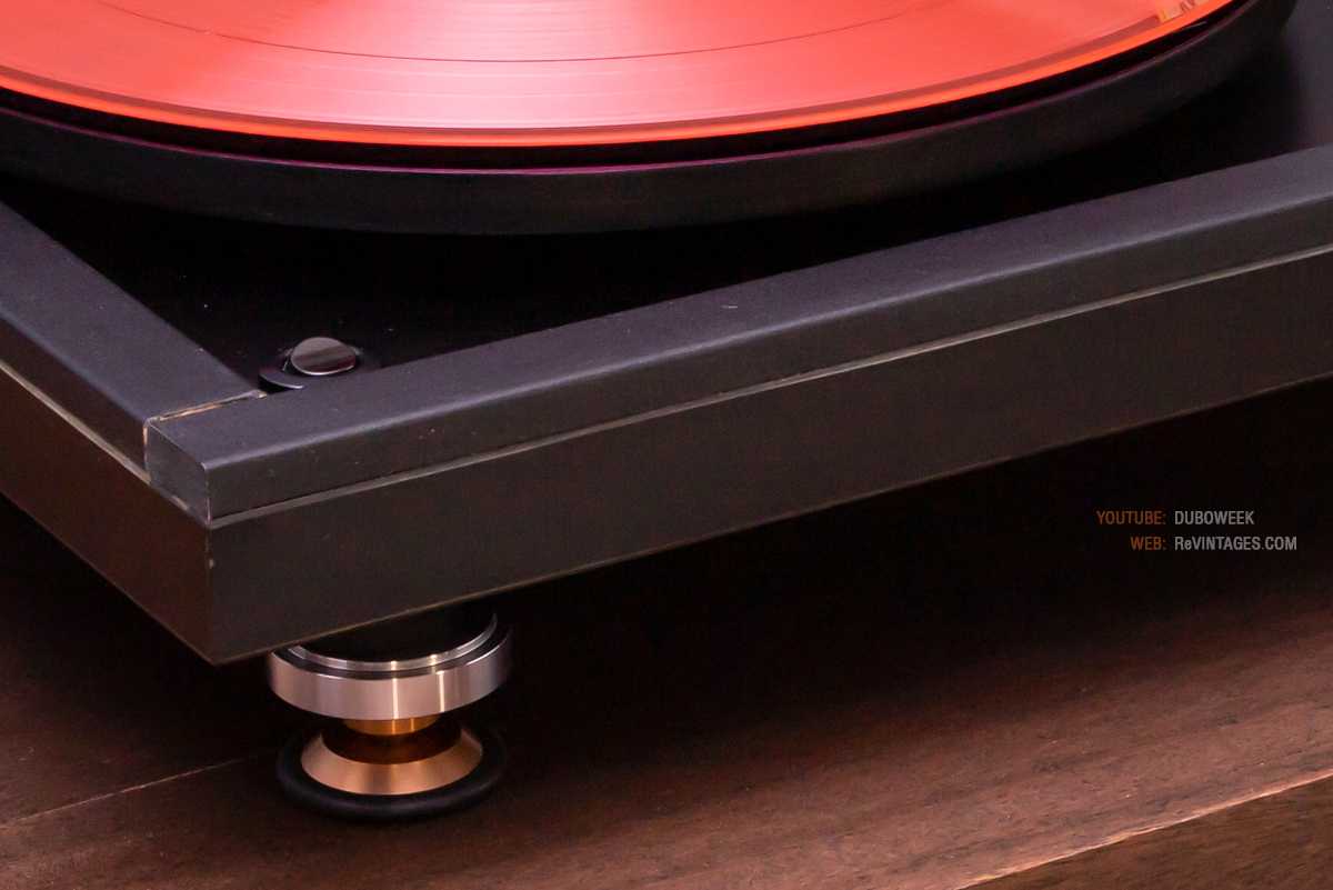 Тяжелый опорный диск RP8 изготовлен из трех слоев ламинированного стекла. На верхний уровень кладется виниловый диск; у двух других масса сосредоточена на внешнем ободе. Задача заключается в сохранении эффекта маховика при малой массе в центре конструкции.
