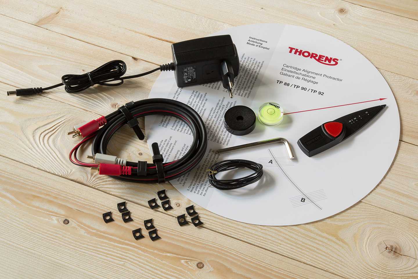 Аксессуары из комплекта поставки и блок питания. На переднем плане — проставки, использующиеся для регулировки высоты тонарма
