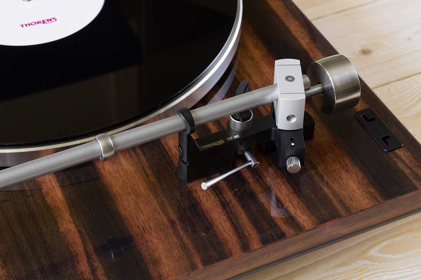 Трубка тонарма алюминиевая, на середине ее длины установлен фирменный демпфер, давно уже знакомый по предыдущим моделям тонармов Thorens. Противовес для настройки прижимной силы имеет удобный ход регулировки, но на нем нет никаких делений, и настройка прижима без весов невозможна. Хорошо, что весы идут в комплекте. Пусть механические, но это тот редкий случай, когда сделаны они качественно, удобны в использовании и достаточно точны для штатной предустановленной головки.