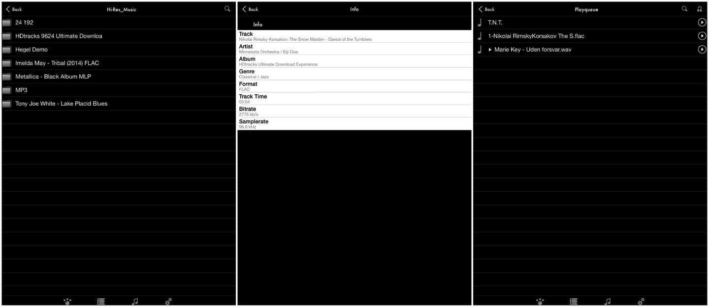 При воспроизведении файлов перемотки внутри трека нет, как и у многих других моделей, так что ничего удивительного. Зато можно посмотреть разрешение файла и битрейт в текущем времени, нажав кнопку «info». Без этого на экран выводится только название группы и композиции, а также обложка и элементы интерфейса, хотя свободное место на экране iPad позволяет разместить еще множество информации.