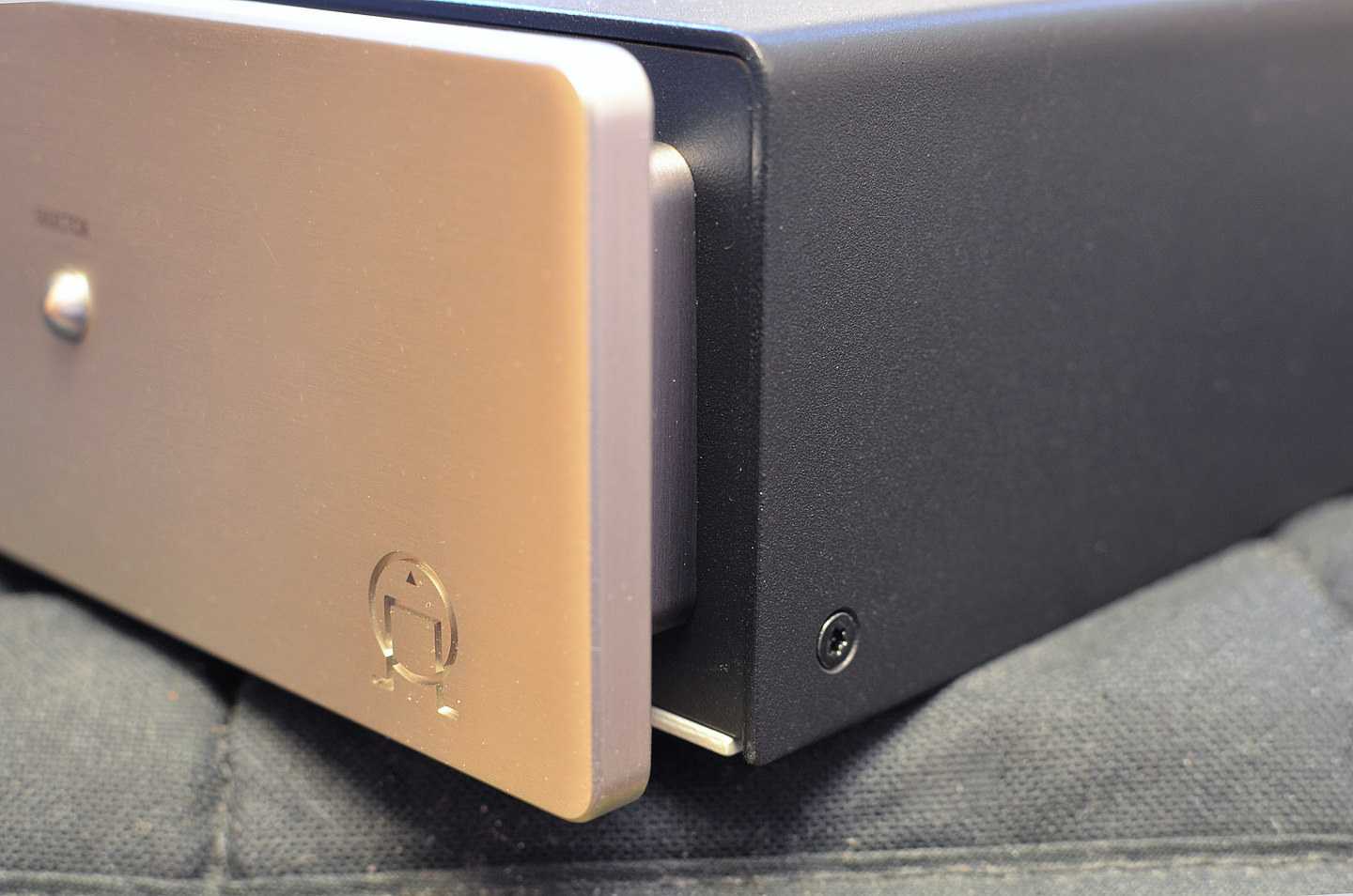 Передняя панель — вообще образец минимализма: никаких дисплеев, две кнопки и светодиоды для отображения текущего состояния проигрывателя. С одной стороны не очень-то информативно и удобно — нет разъема для подключения флешек (он на задней панели), но я готов все это простить, потому что иначе разрушится целостный образ и пропадет фирменный шарм. Вся конструкция покоится на трех мощных антивибрационных ножках.