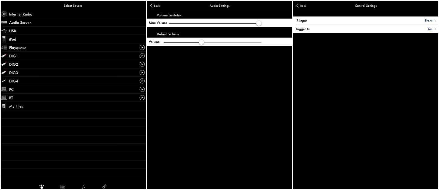 Итак, интерфейс приложения простой и понятный, однако на русский язык не переведен. Есть возможность управлять не только воспроизведением, но и переключать входы, регулировать громкость (если не использовать предусилитель, можно установить громкость на максимум и забыть об этой функции). Также приложение позволяет конфигурировать сетевые настройки, задавать работу триггерных входов/выходов и ИК-приемников.